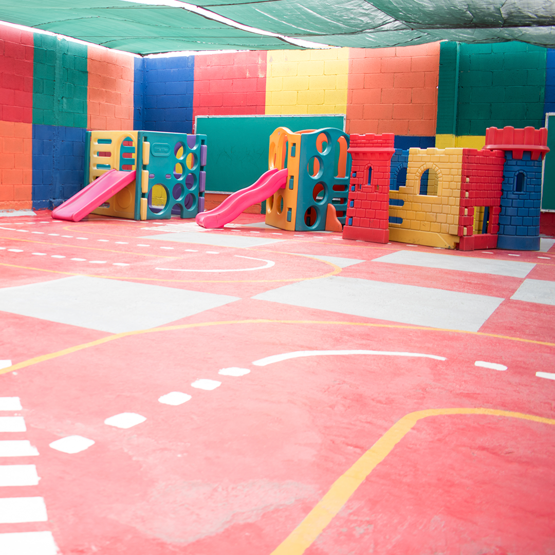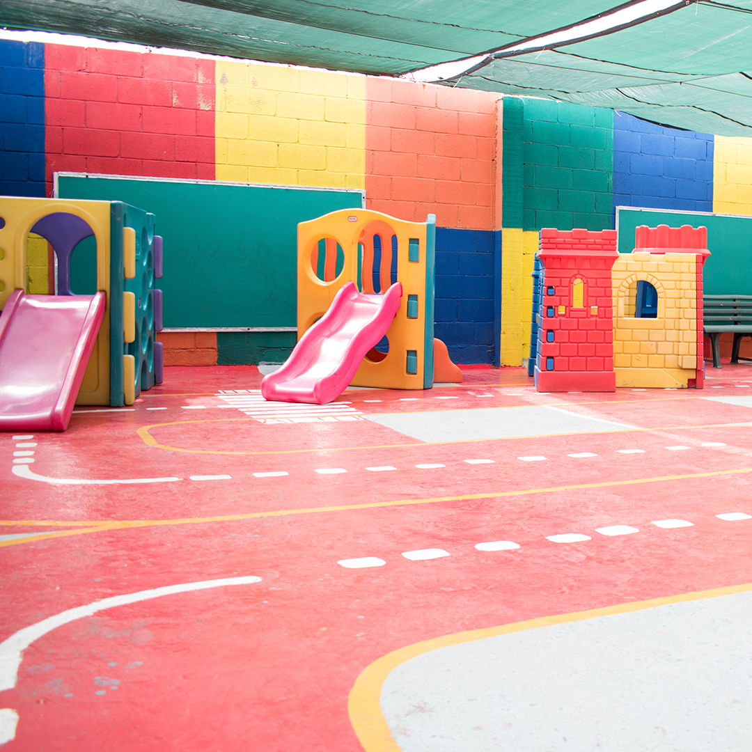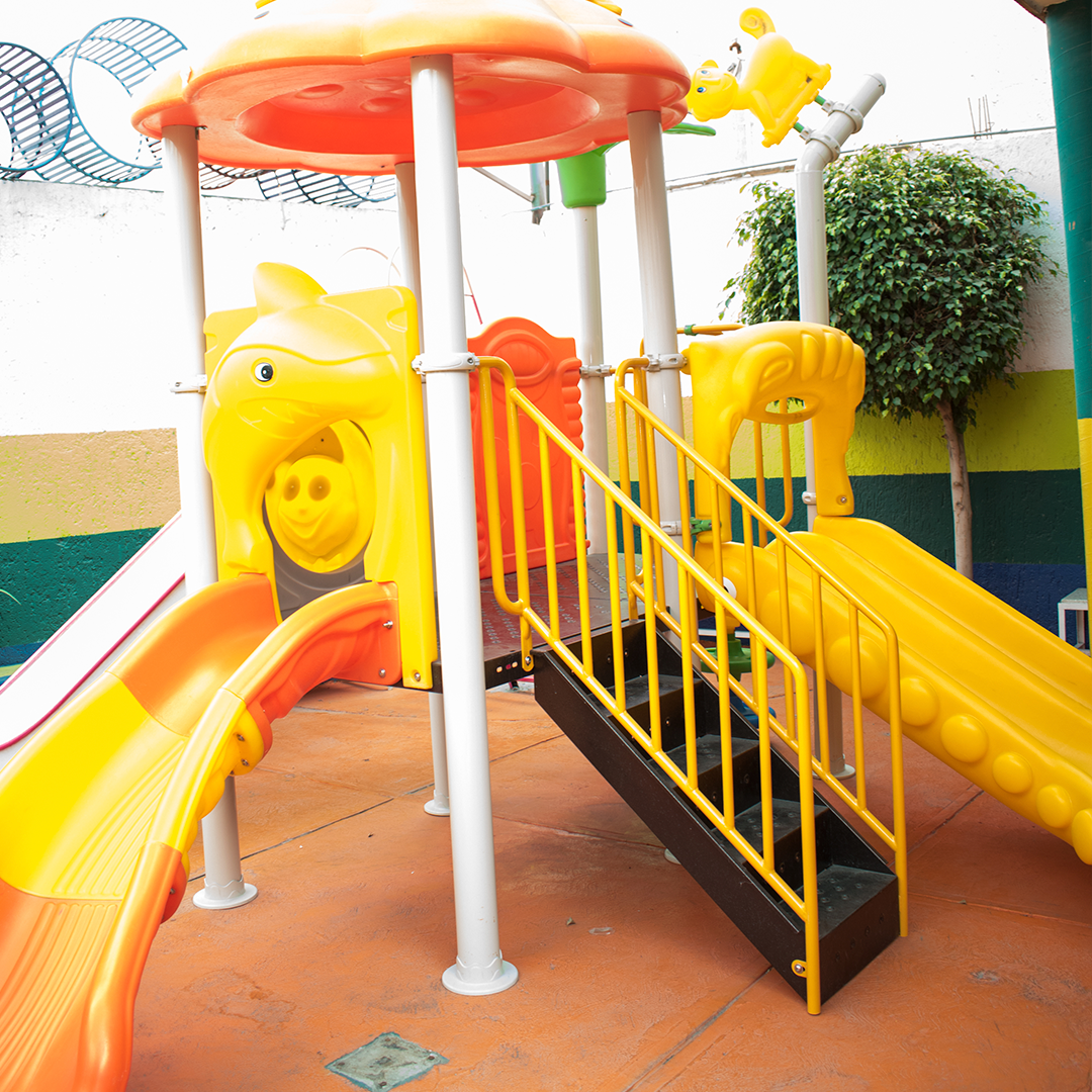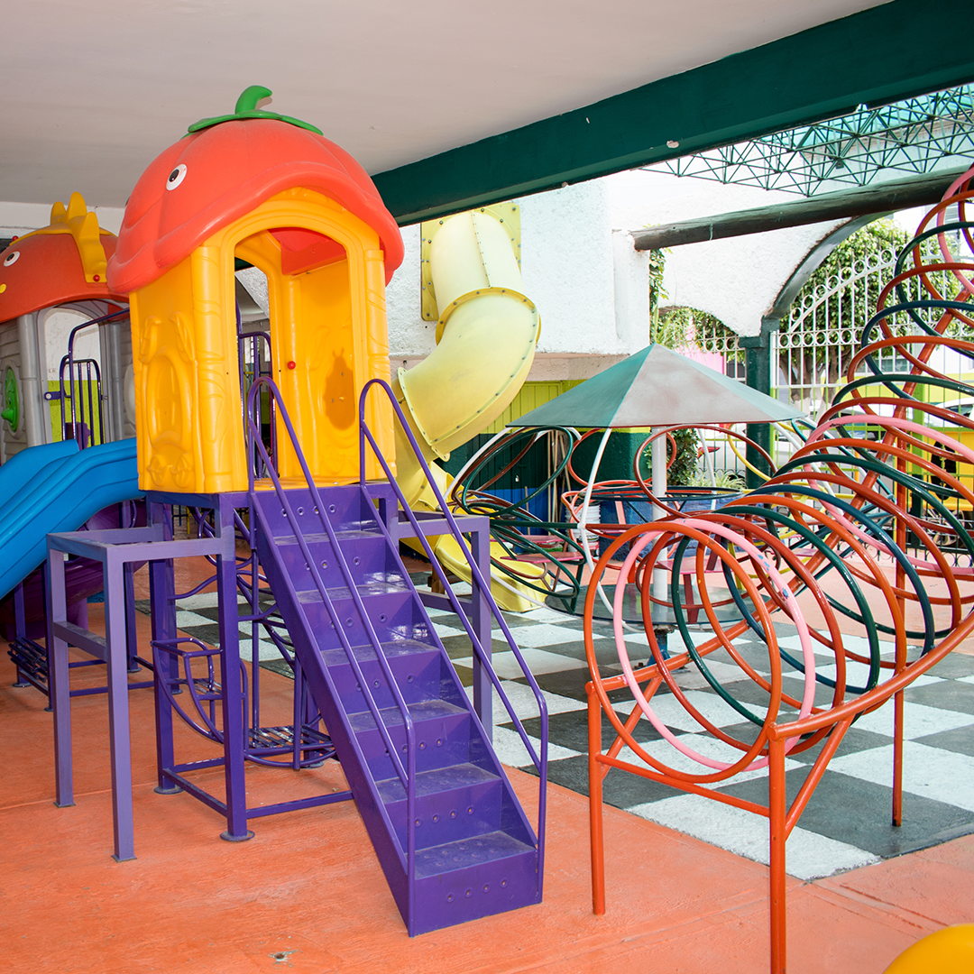 Cuenta con dos edificios conectados con un puente por seguridad de sus hijos con patios techados, patios al aire libre, área de juegos, ludoteca, salón de cómputo y enfermería