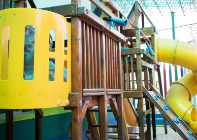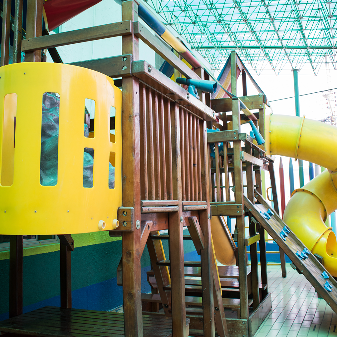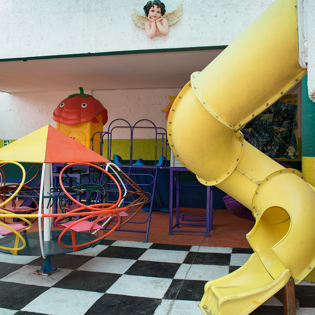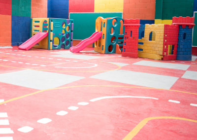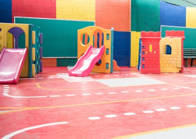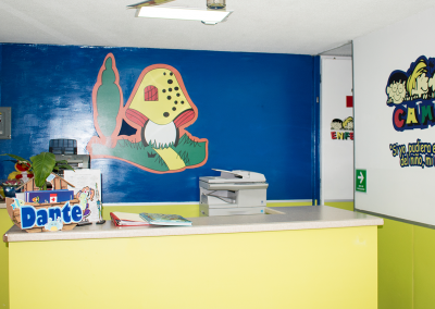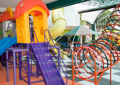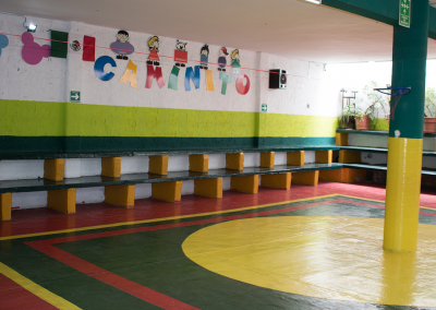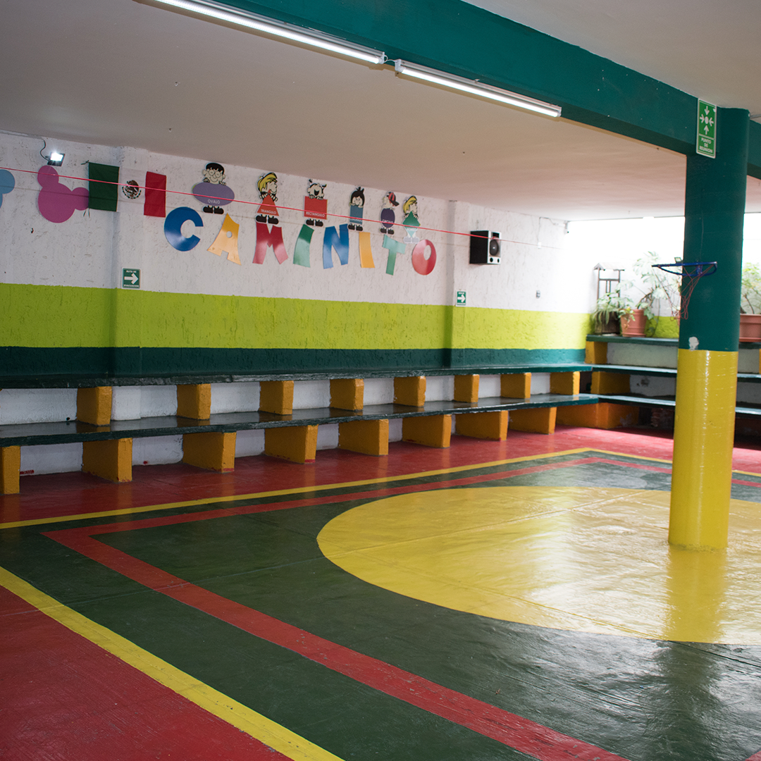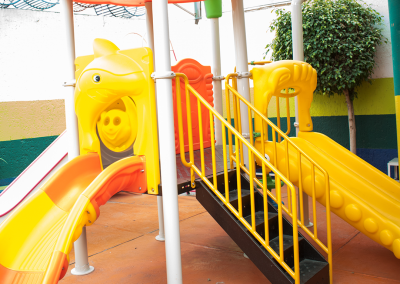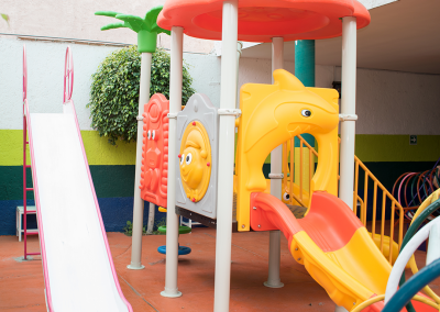 Cuenta con dos edificios conectados con un puente por seguridad de sus hijos con patios techados, patios al aire libre, área de juegos, ludoteca, salón de cómputo y enfermería